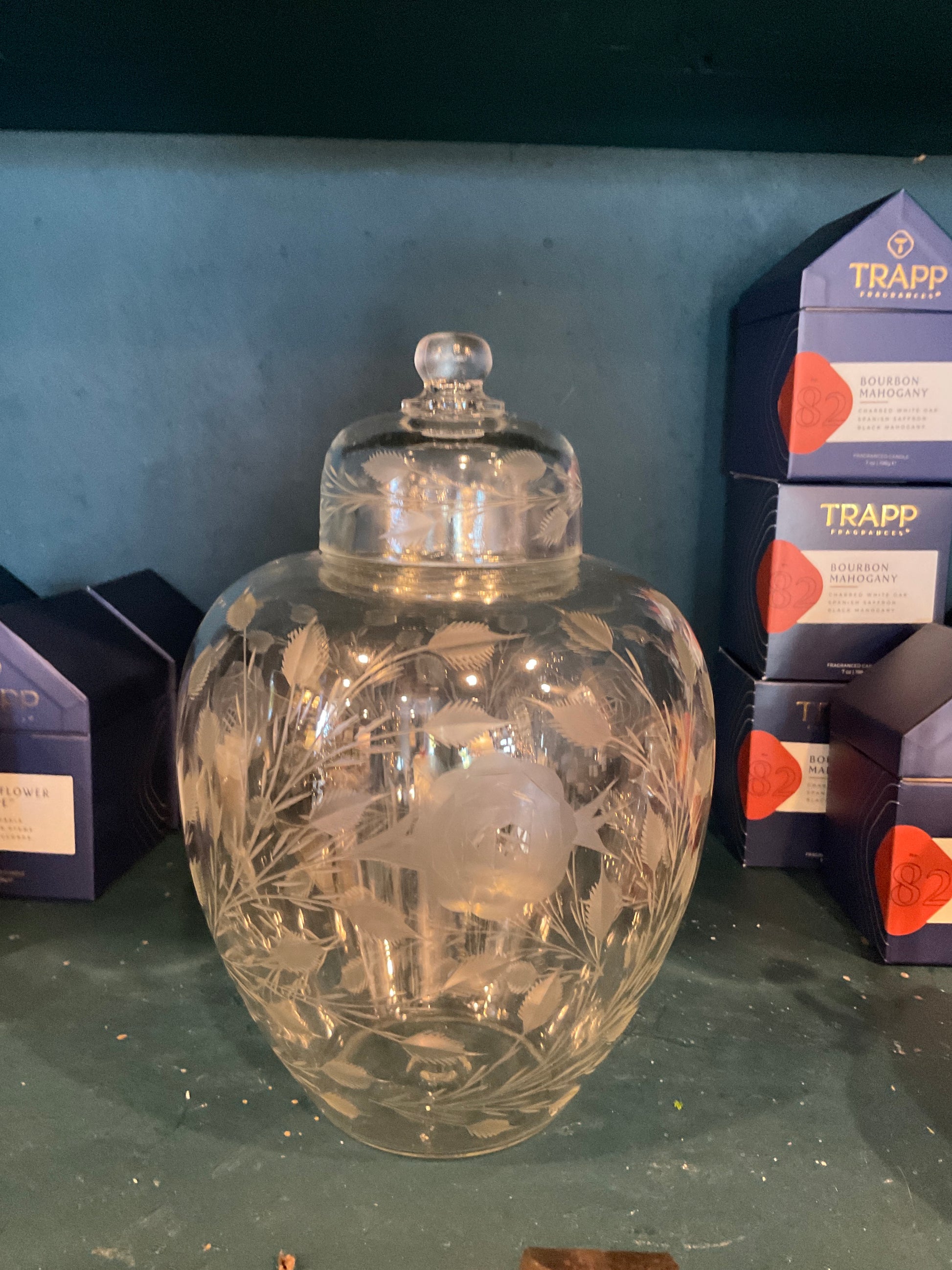 Etched clear glass ginger jar with lid 10” H. Call store for shipping