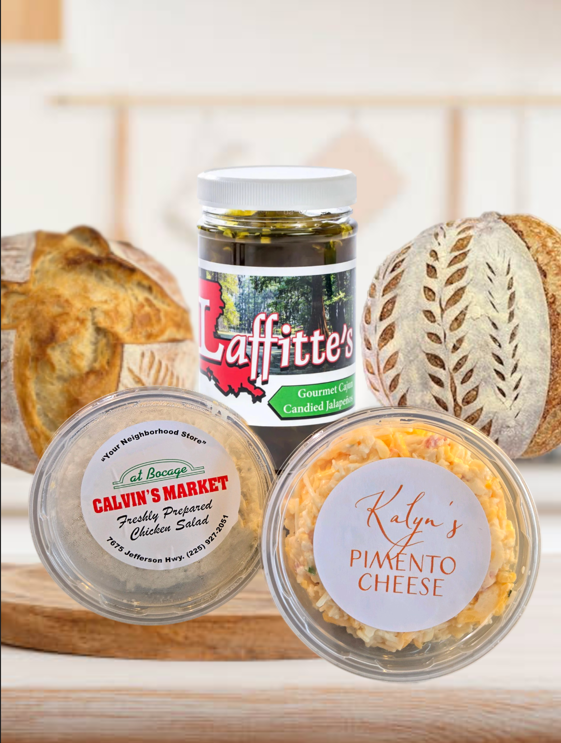 Loaf of sourdough bread, loaf of jalapeño sourdough bread, Calvin’s chicken salad, Kalyn’s pimento cheese, Laffitte’s candied jalapeños